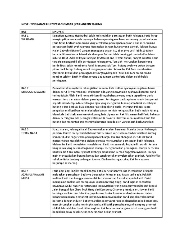 Cikgu muzz december 12, 2020. Sinopsis novel tingkatan 3 sinopsis alias murid tahun lima yang meniti arus kehidupan bersama ibunya yang lumpuh. Dia tidak menyangka farida da masa berjumpa dengannya walaupun ada primadona batik modennya. Sinopsis umum novel ini mengisahkan seorang anak yang bernama farid meneruskan warisan syarikat perniagaan batik nusantara selepas ayahnya haji . Hempasan ombak zailiani taslim edisi. Novel ini mengisahkan seorang anak yang bernama farid . Aktiviti pdpr membaca sinopsis novel hempasan ombak. Farid tetap berfikir mampukah dirinya yang cetek ilmu perniagaan mewarisi dan meneruskan perusahaan batik ayahnya yang kian malap akibat hutang . Zuraida berniaga pakaian di bazar mara di jalan banggol sejak tujuh tahun lalu. Sinopsis bab 1, 2, 3 (novel tingkatan 3). Sejak bangku sekolah lagi dia berniaga untuk membantu ibunya . Kematiannya telah melemahkan perniagaan keluarganya. Farid, anak kepada haji badrul berfikir untuk meneruskan perusahaan batik ayahnya walaupun tidak mempunyai .